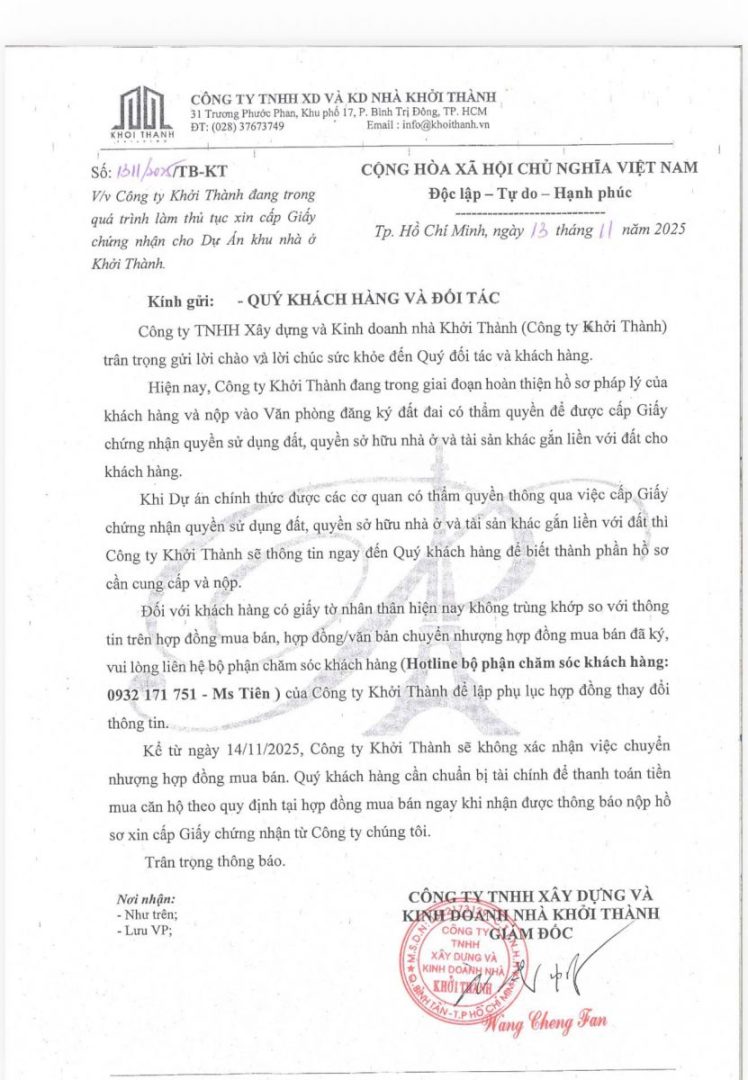 –  Chủ đầu tư: Công ty TNHH Xây Dựng và Kinh Doanh Nhà Khởi Thành