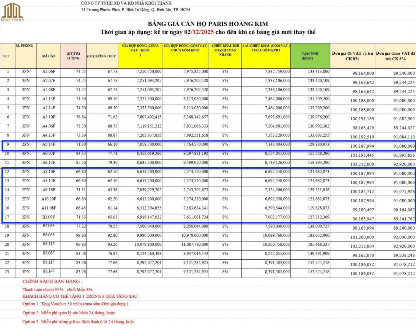GIÁ BÁN CĂN HỘ PARIS HOÀNG KIM