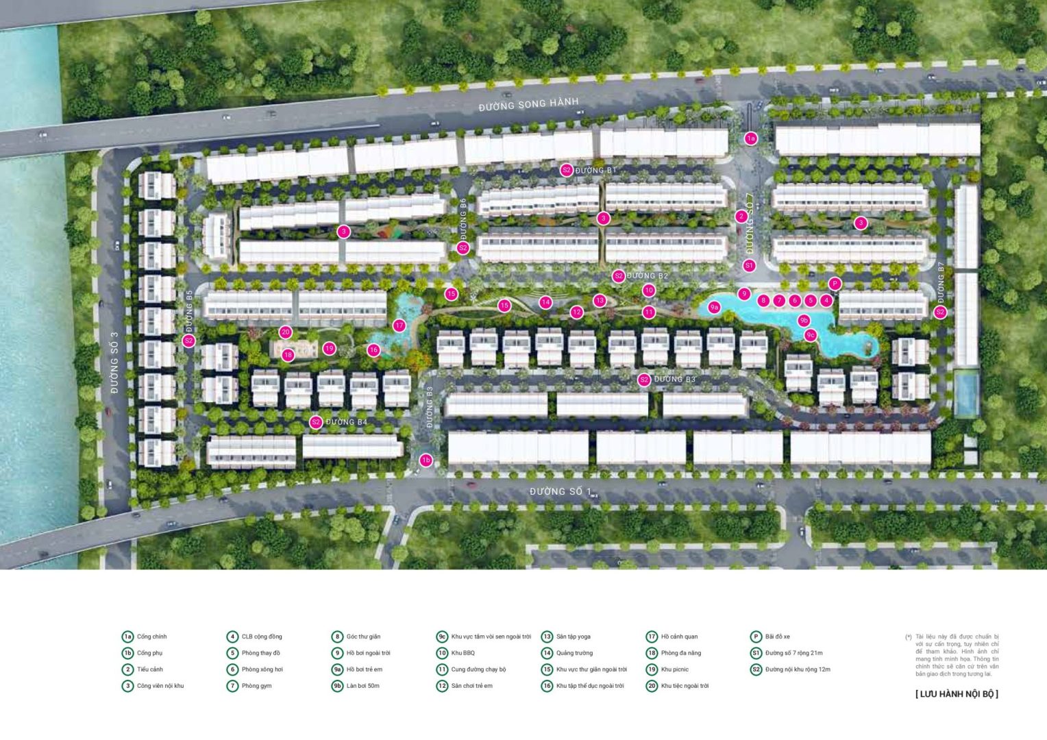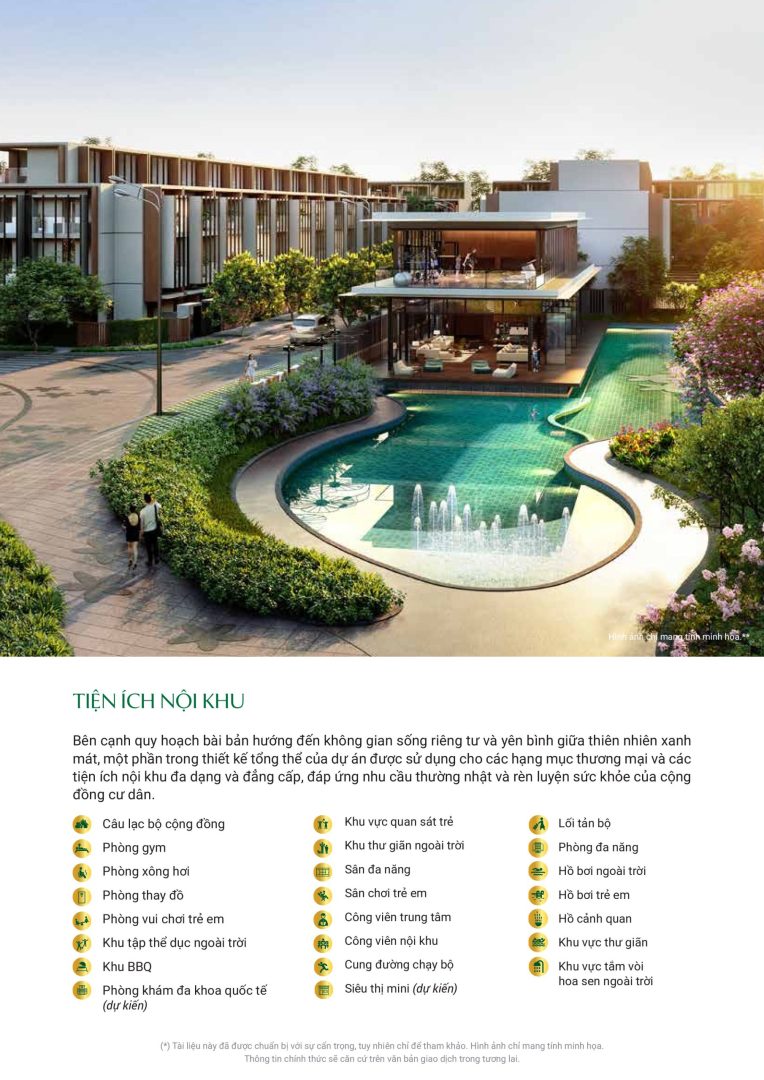 | Tiện ích nổi bật | Khu compound an ninh 24/7, Clubhouse, hồ bơi resort, công viên ven sông, đường chạy bộ 1km, sân chơi trẻ em, vườn BBQ, phòng gym, phòng xông hơi. |